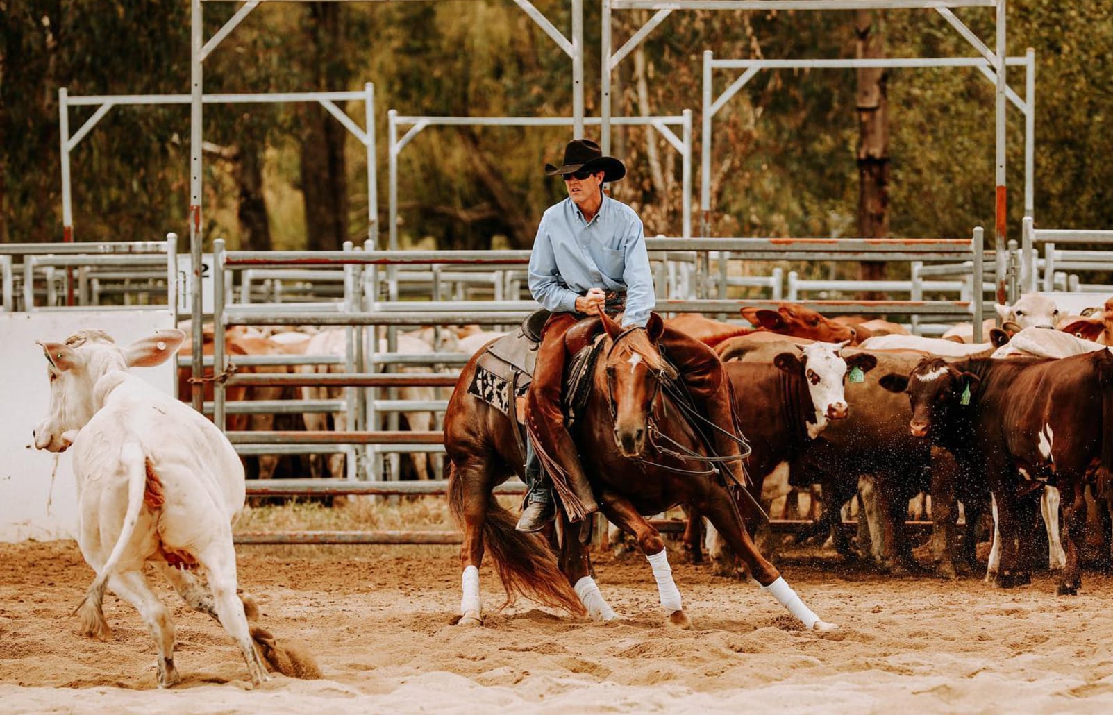 Once the rider has the cow in the right place, he puts both hands on the saddle and the horse then takes over, working like a sheep-dog.