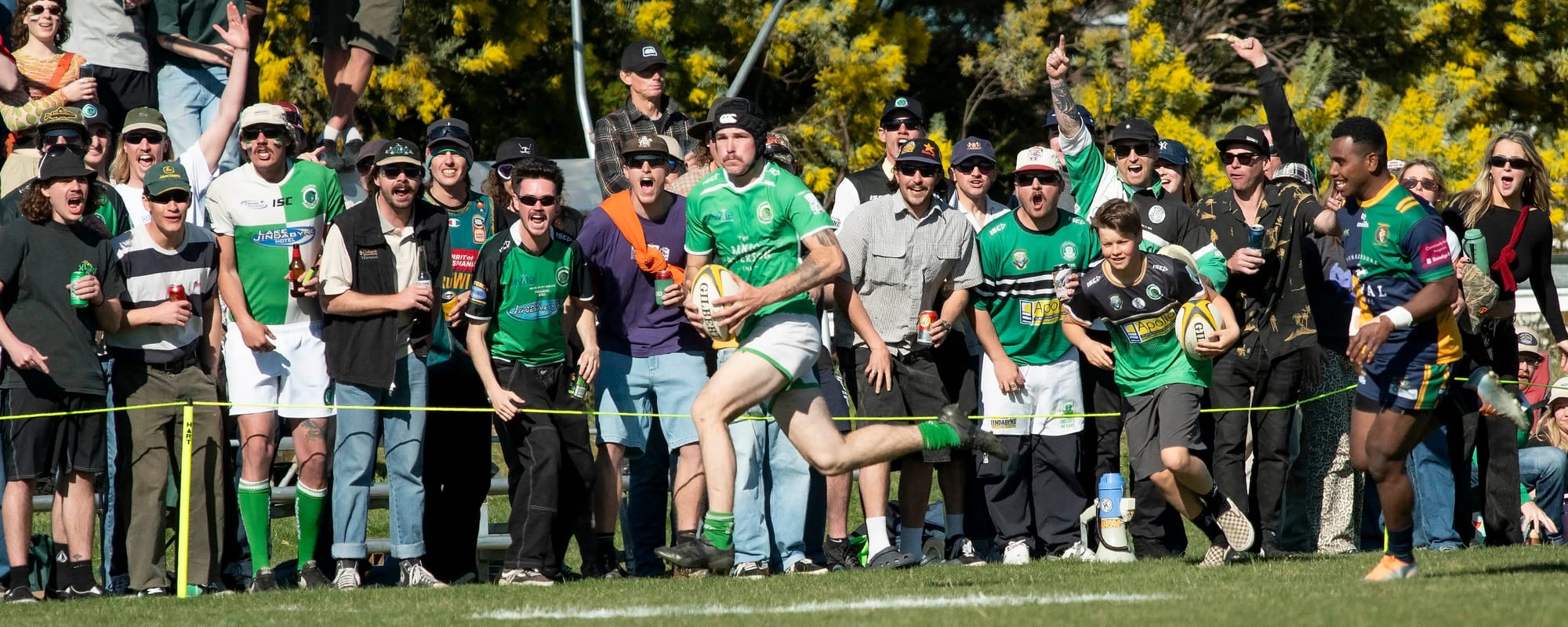 The Bushpigs are now opening up holes in the defence on both wings whenever they spread the ball wide. Ryan Goodall finds room on the left wing and makes a break in front of the grandstand. The home crowd in vociferous approval.