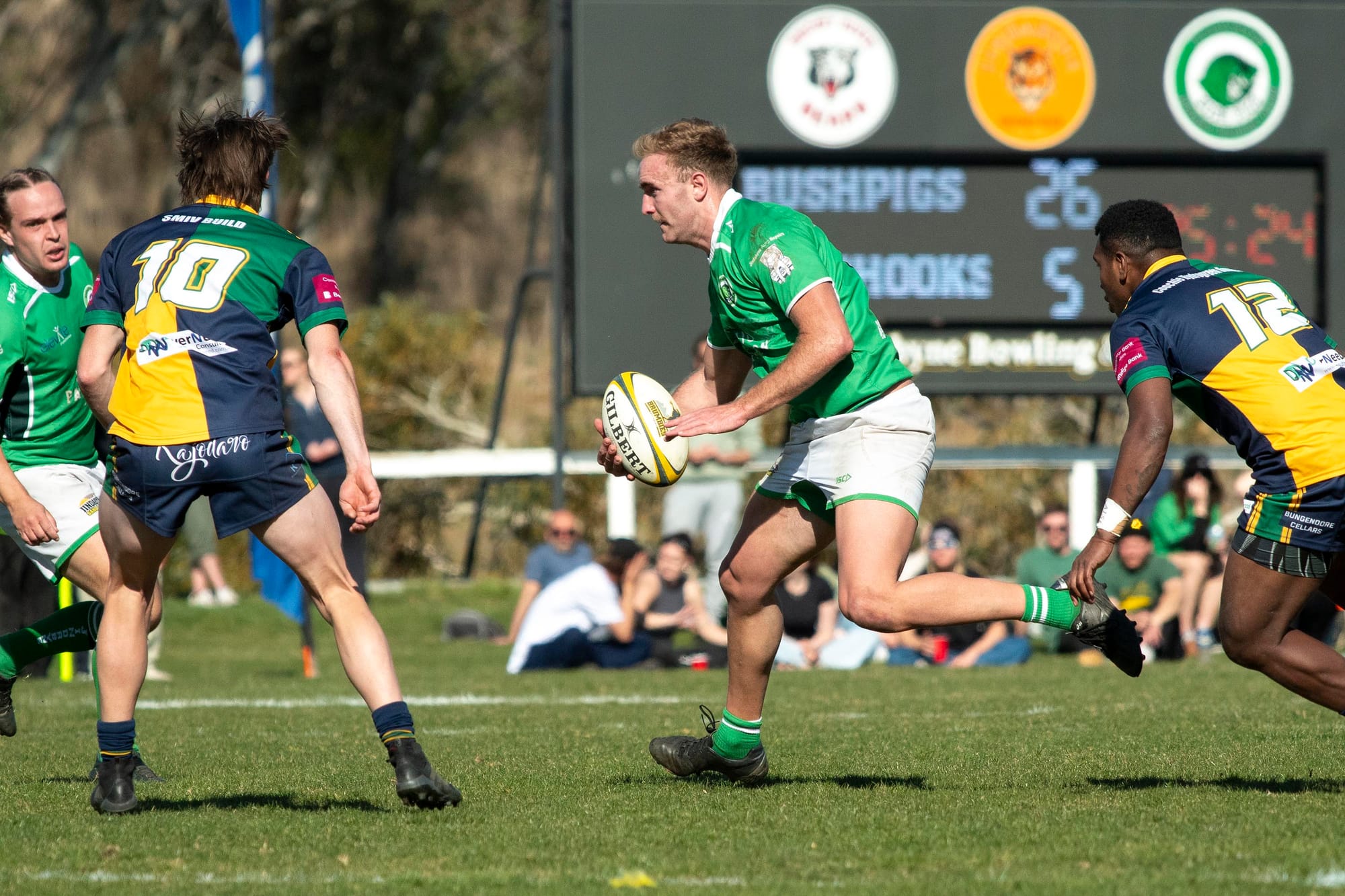 Brock Freeburn links with Finn Chatten down the right flank, Chatten taking the ball well into the opposition territory with the sideline crowd cheering. Fullback Ryan Goodall chimes into the attack and the Bushpigs threaten again.