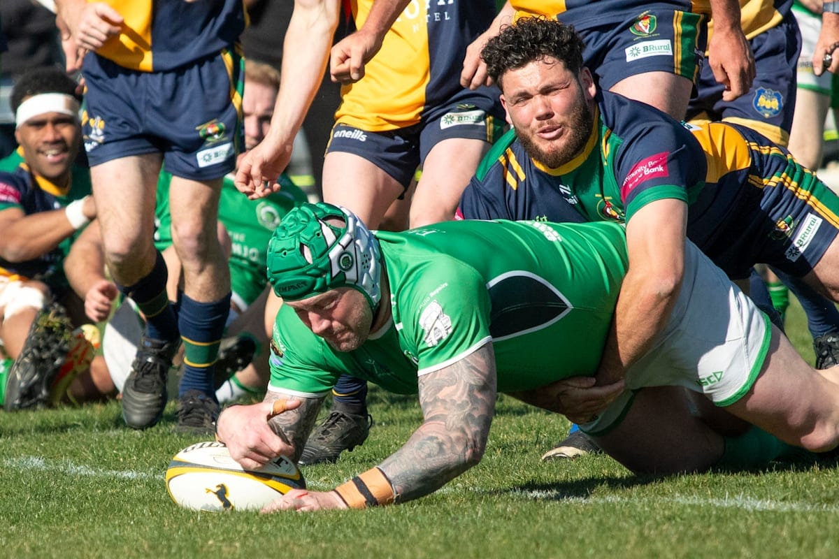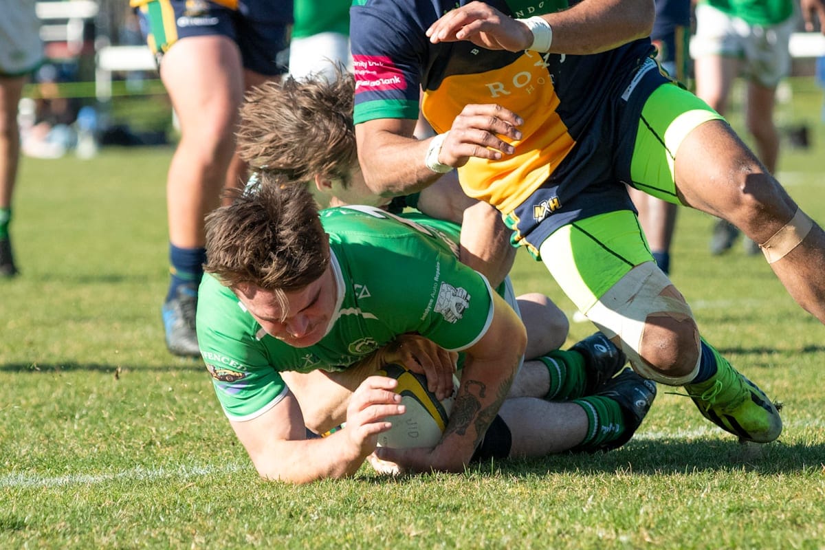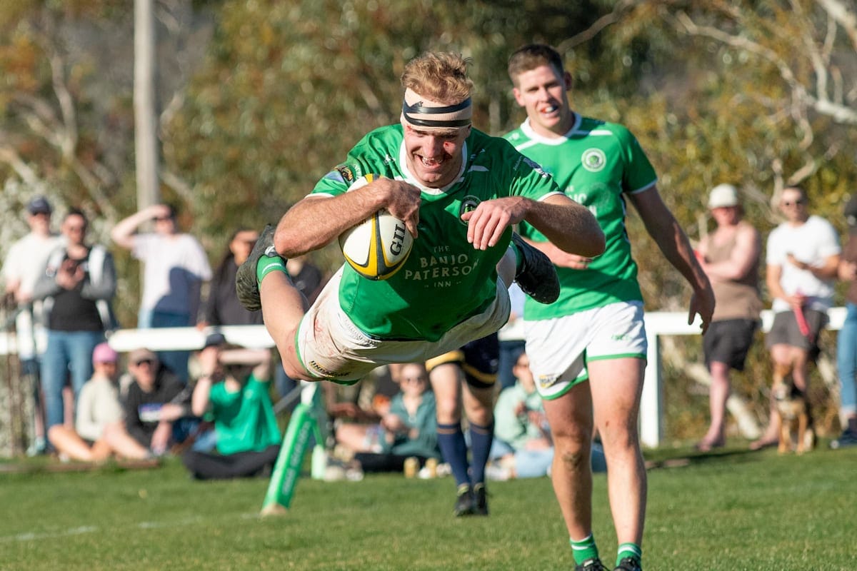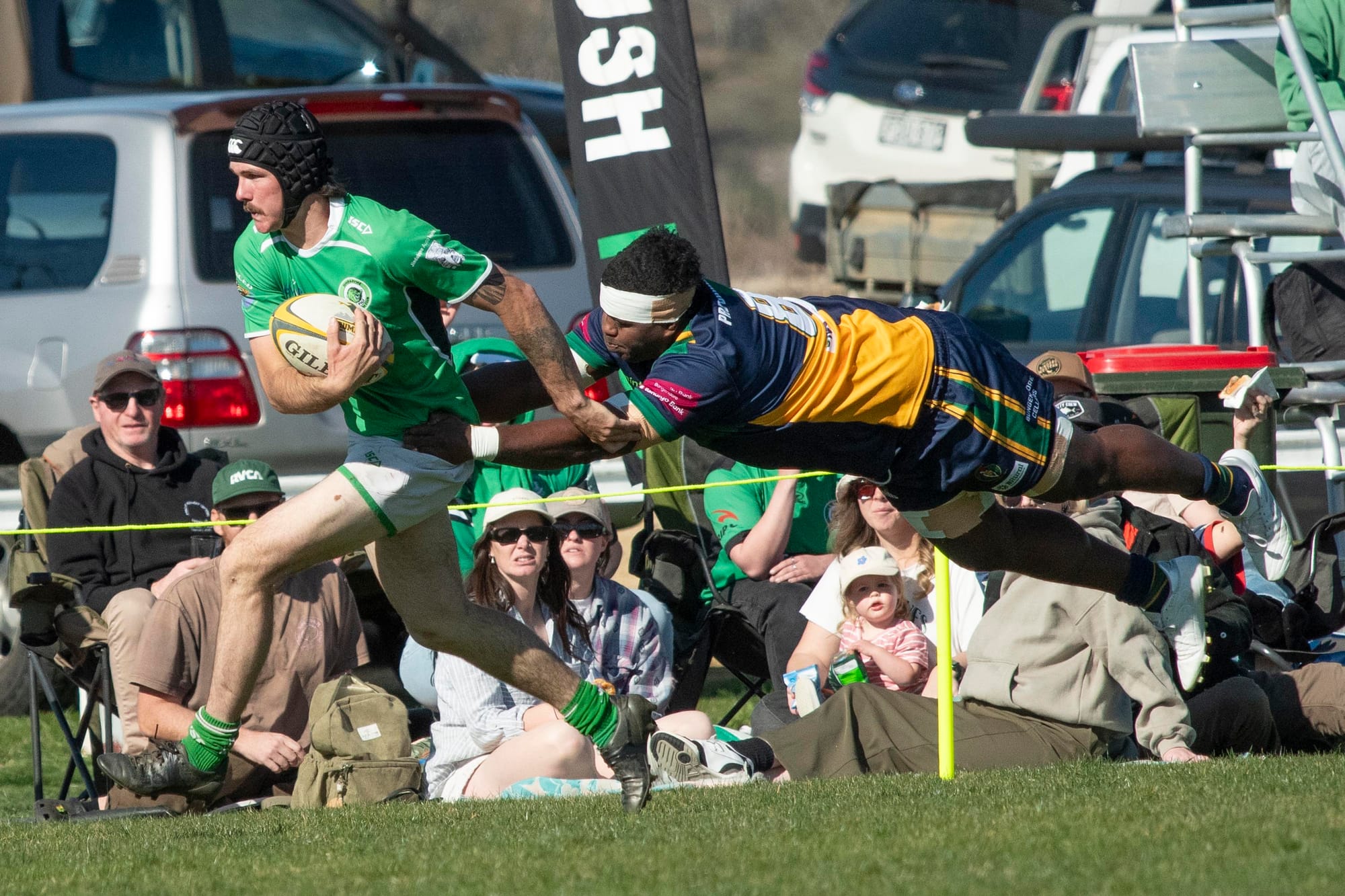 Jackson Stewart looks to pass close to the line but instead runs and scores, a spectacular dive purely for the enjoyment as the Bushpigs now have one hand on the trophy. Bushpigs lead 40-20.