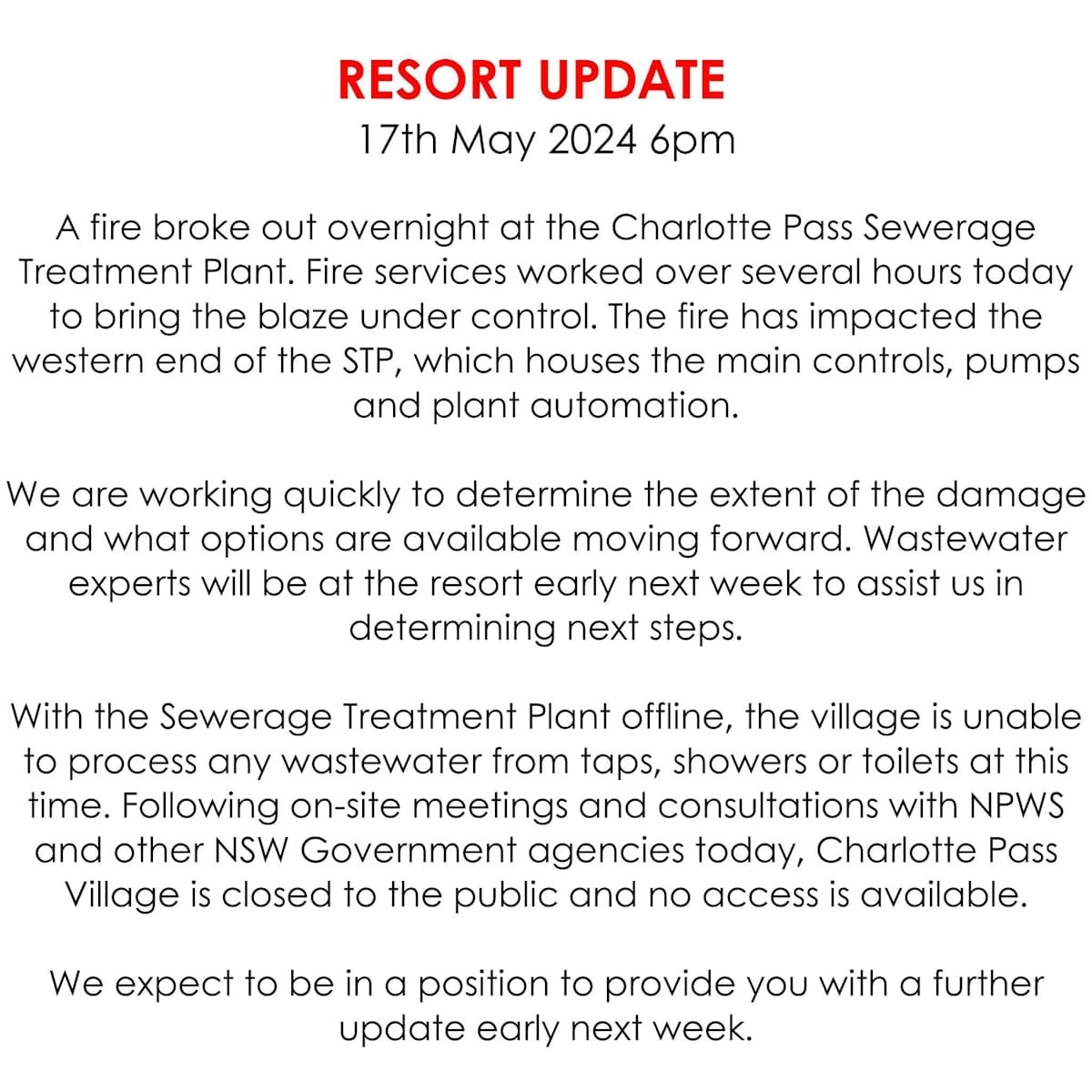 A devastating fire at Charlotte Pass Snow Resort’s sewage treatment plant on Friday 17th May has the resort management assessing the damage and the impact it could have on their looming snow season.