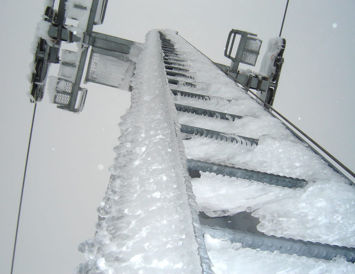 Working as a team, one maintenance member is based in the drive station, and up to three others will climb a tower each and de-ice, then move progressively downhill to another tower until all the towers have been de-iced and the lift ready to be started. They then position themselves to view the towers as the lift is moved in short moves to check all is functioning correctly. On occasions, a fitter may have to re-climb a tower if the sheave does not turn.