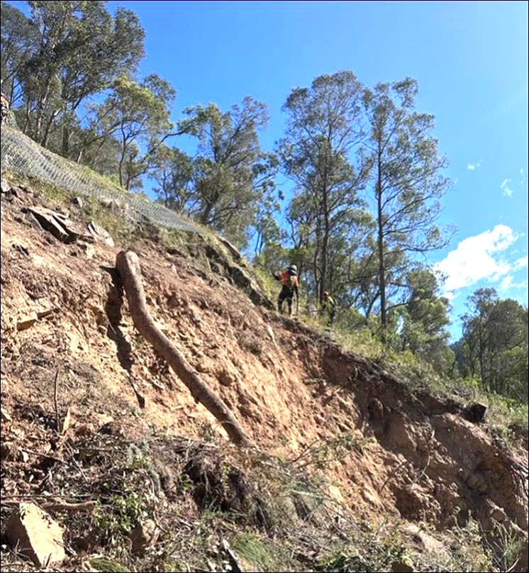 - With the safe working platform above the slip site established, Rutledge Drilling will use rope access to manually scale and remove debris from the crest initially, and then continue to work down slope, progressively removing rocks and loose material whilst continuously placing the drop mesh over the exposed slope.