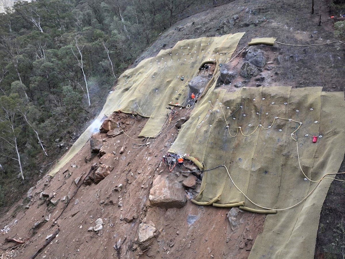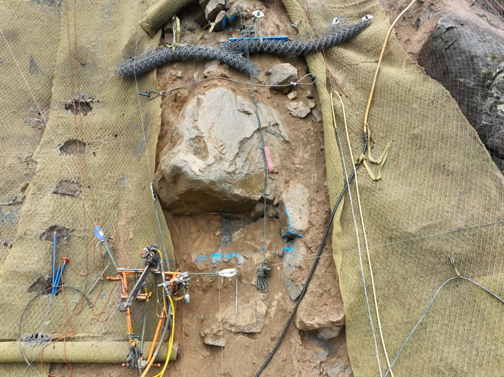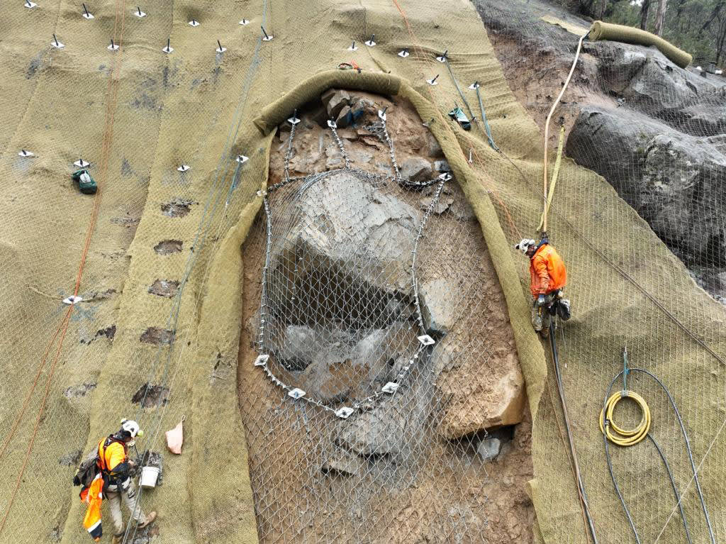 • The drilling and bolting work to fix spider mesh panels over the large rock outcrops that could not be removed from the slip face is complete which assists in securing these rocks in place (see photos below).