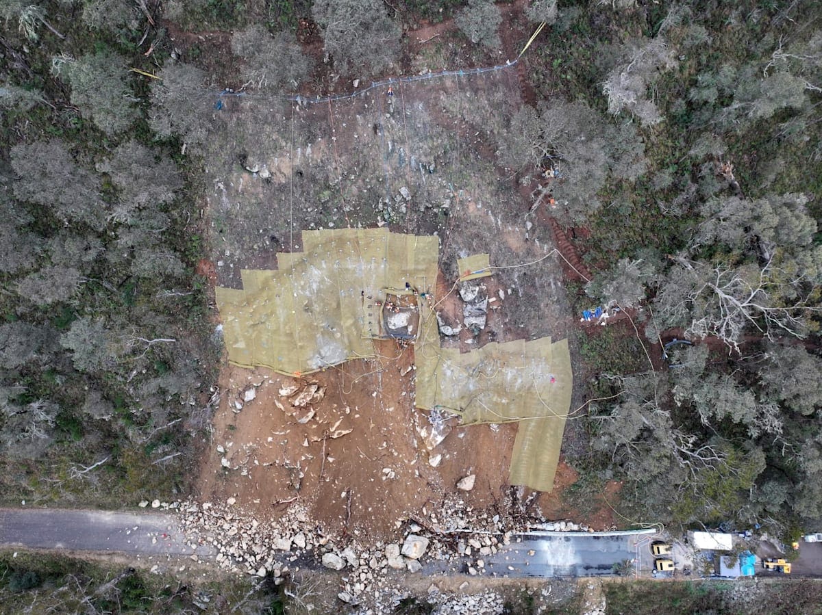 A drone image showing workers carrying out works on the slip face. The extent and size of the slip is in context when compared to the people on the slope.
