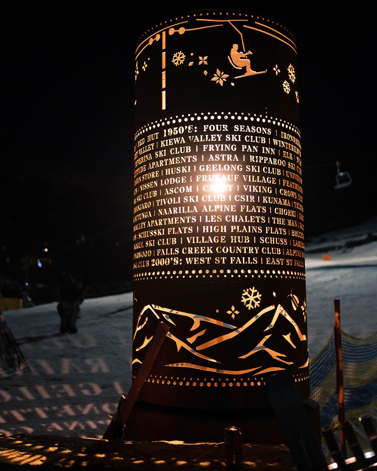 Visitors to Falls Creek can enjoy the light shapes projected out onto the snow at Slalom Plaza when it lights up at night. They can spot the lodge where they are staying, displayed in chronological order of the decade in which they were built, wrapping around the sculpture and enjoy the acknowledgement of the built history of Falls Creek village.