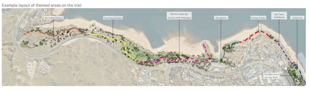 The design principles for the area state it will create presence of Monero-Ngarigo Culture, stories and values and celebrate the diverse history of all Jindabyne people, culture and heritage.