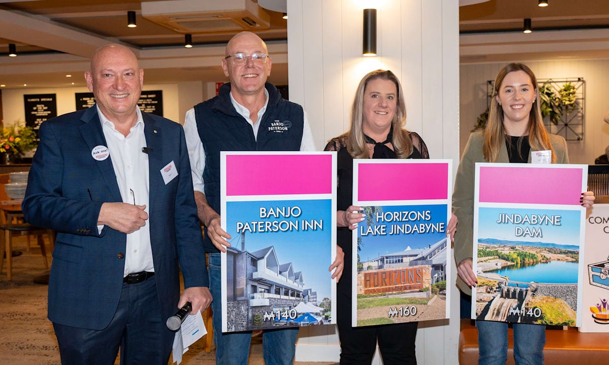 The three pink properties have a Jindabyne focus. The Jindabyne Dam, Banjo Paterson Inn, and Horizons Lake Jindabyne, accompanied by the Utility of Snowy Hydro.