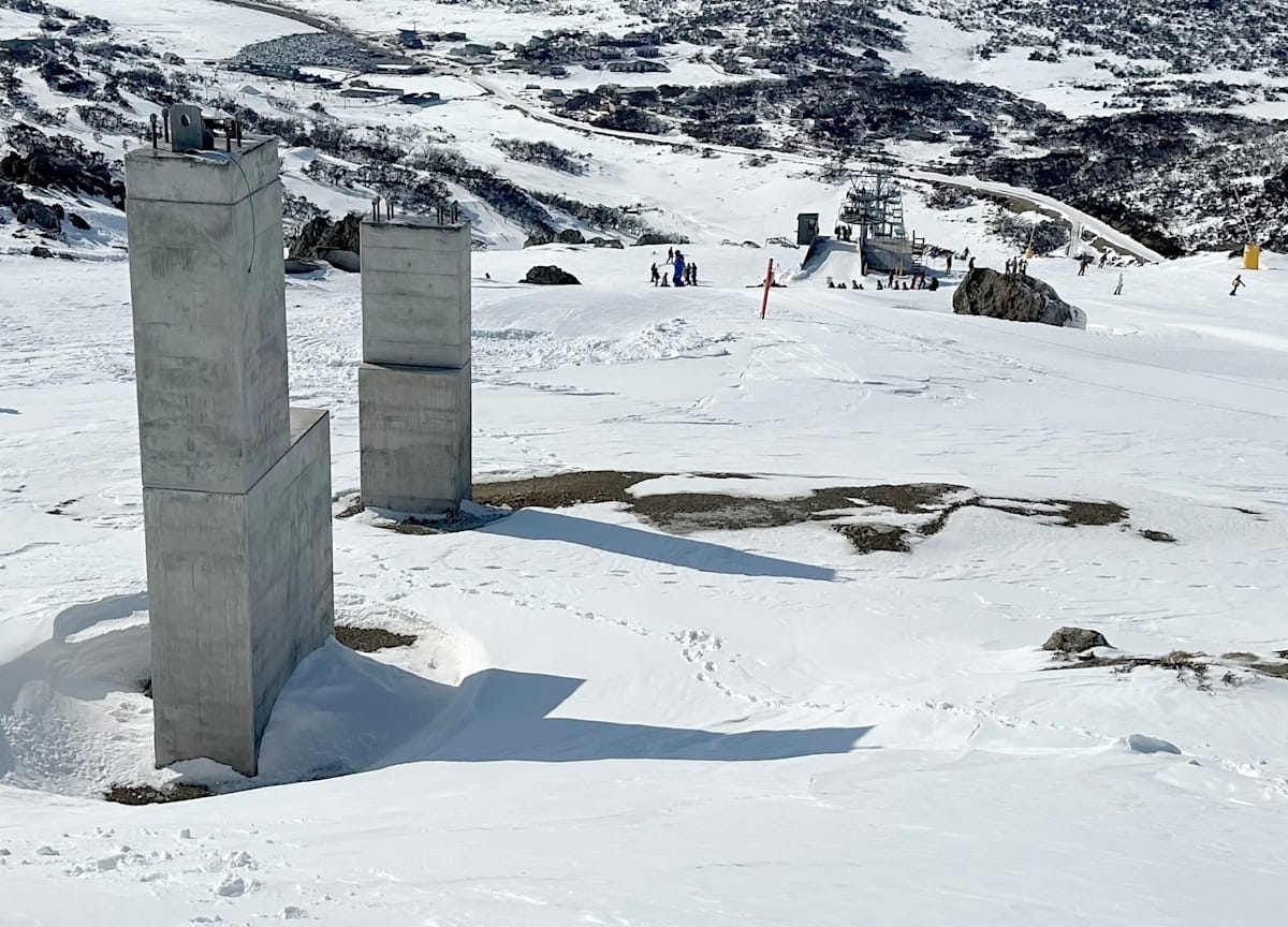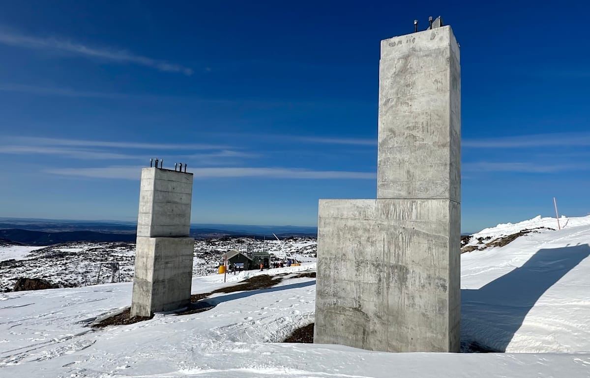 During August, Snowy Mountains Magazine ventured to the top to firstly look at the initial completed works. The large concrete mast will be the mainstay of the new lift top station and Australia's highest lifted point at 2042 metres above sea level.