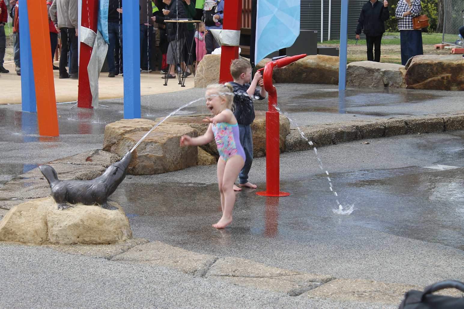 A number of local children were exploring the landscape of the splash park before the speeches were even over.