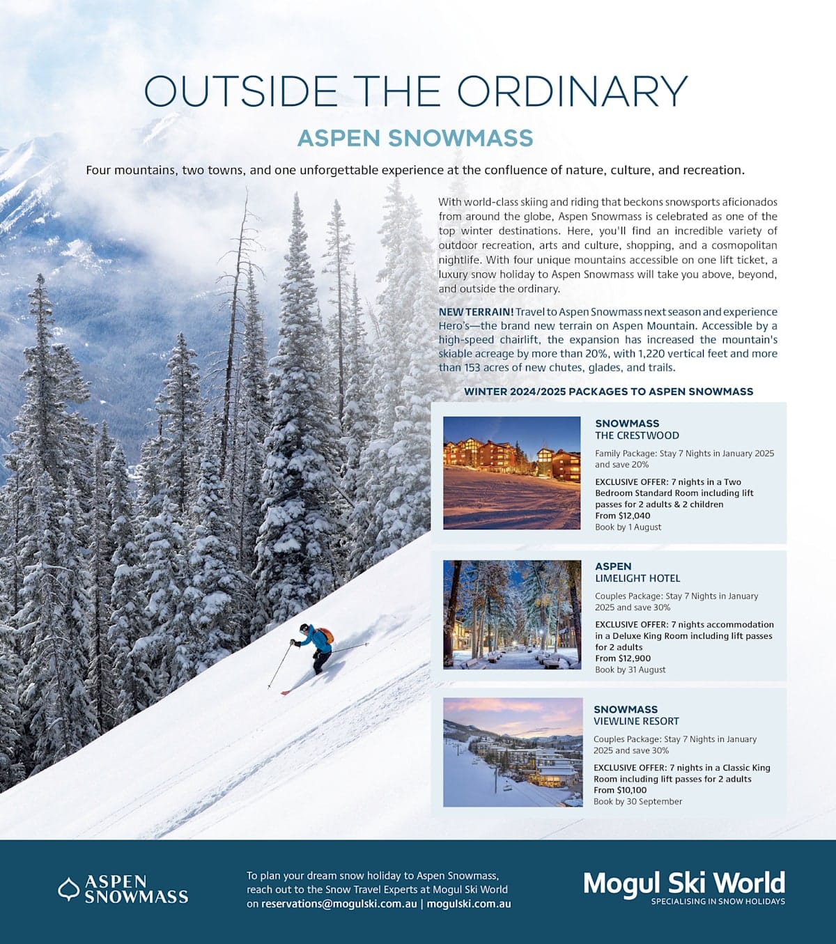 To experience Hero’s for yourself this winter, let Mogul Ski World’s Snow Travel Experts create your dream Aspen Snowmass snow holiday. Early Bird Specials are on offer now for a limited time, so reach out on reservations@mogulski.com.au to start planning today.