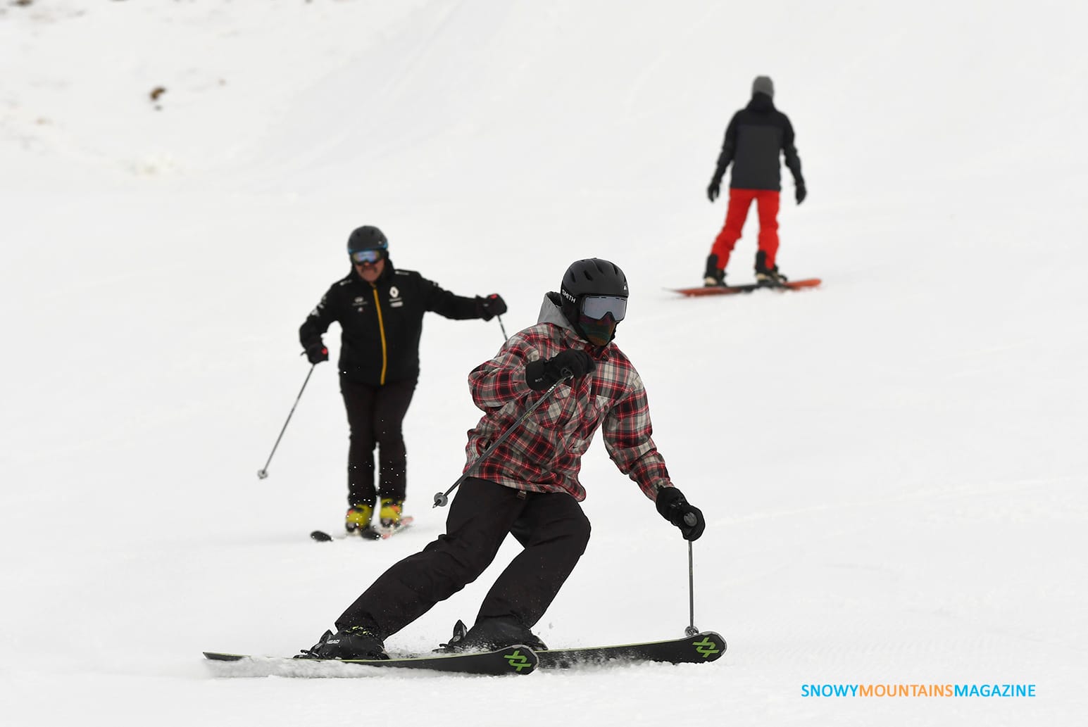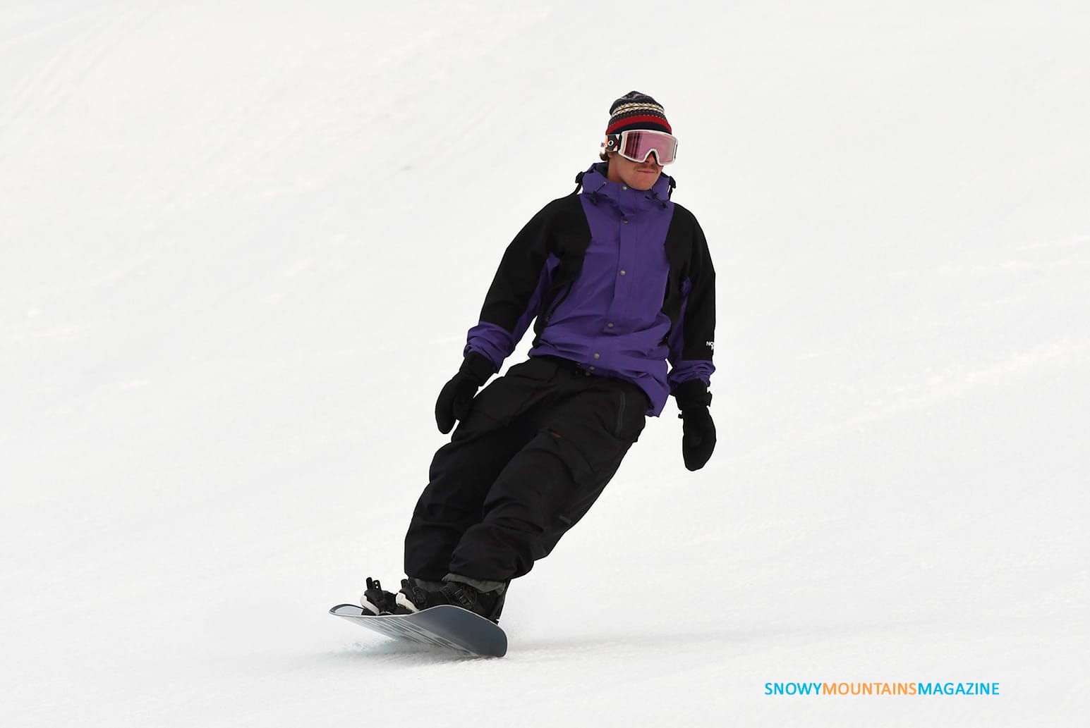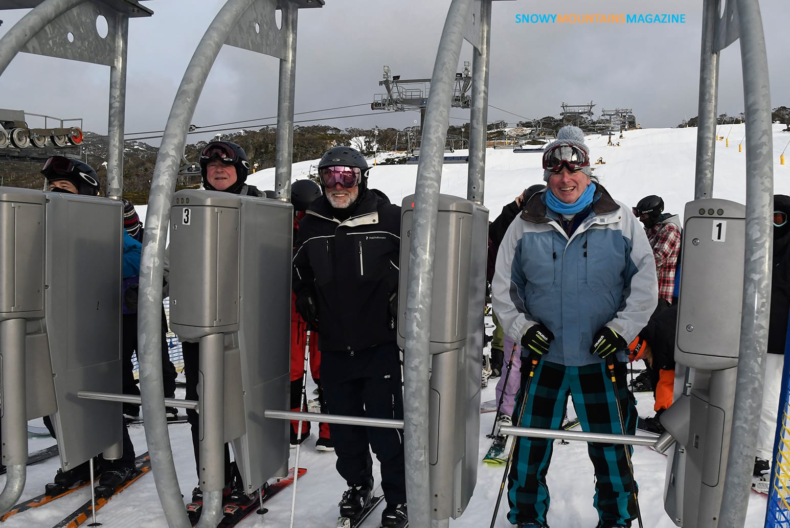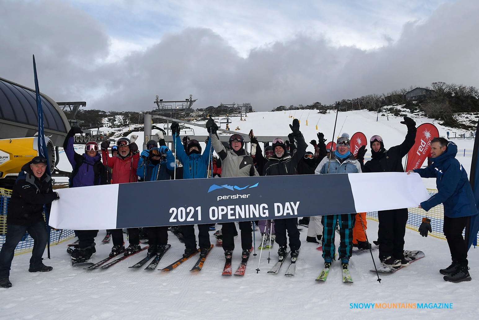 After the traditional gathering behind the opening banner for photos and videos, the crowd were whisked up the Village Eight Express and carving up Perisher's Front Valley slopes.