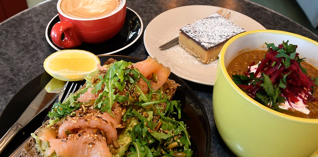 Choose from a selection of delicious wraps, including the legendary breaky wrap, chicken avocado on Turkish, egg & bacon Turkish roll, coffee, cakes and slices, tasty salads