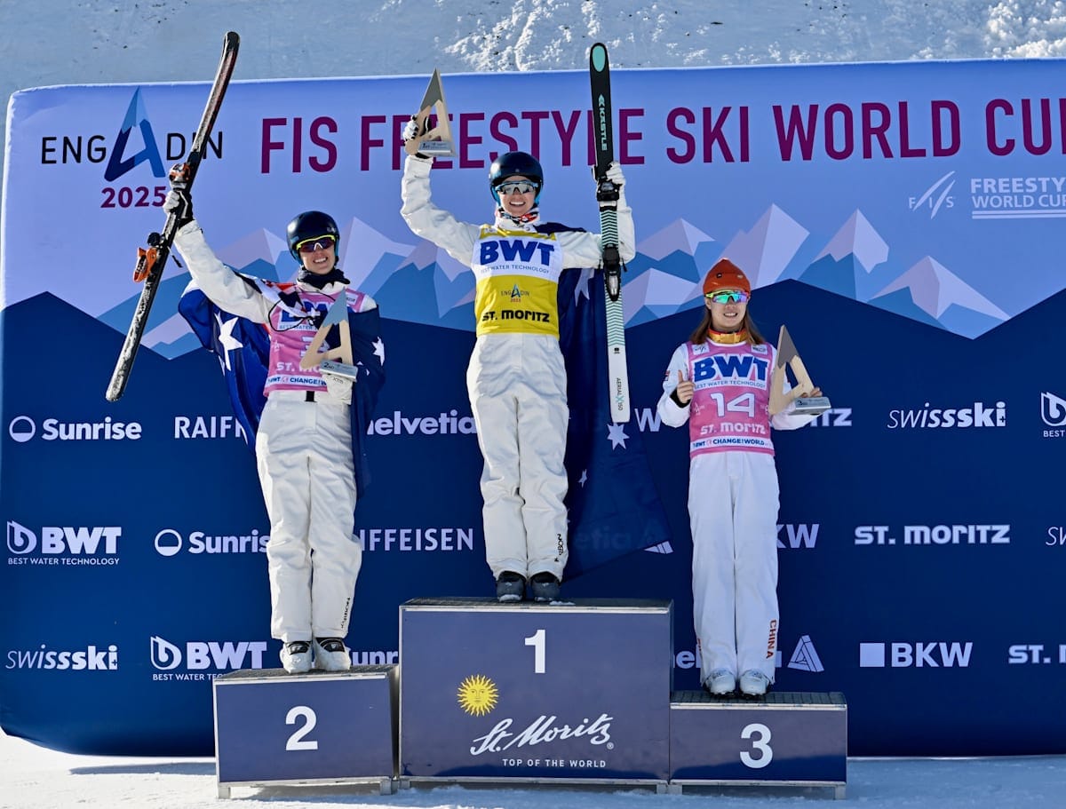 Australian aerial skiers have recorded an amazing double podium performance, with Danielle Scott and Laura Peel taking home gold and silver at the World Cup competition overnight in Engadin, Switzerland, the second time the pair have taken the first two spots on the podium in the same event.