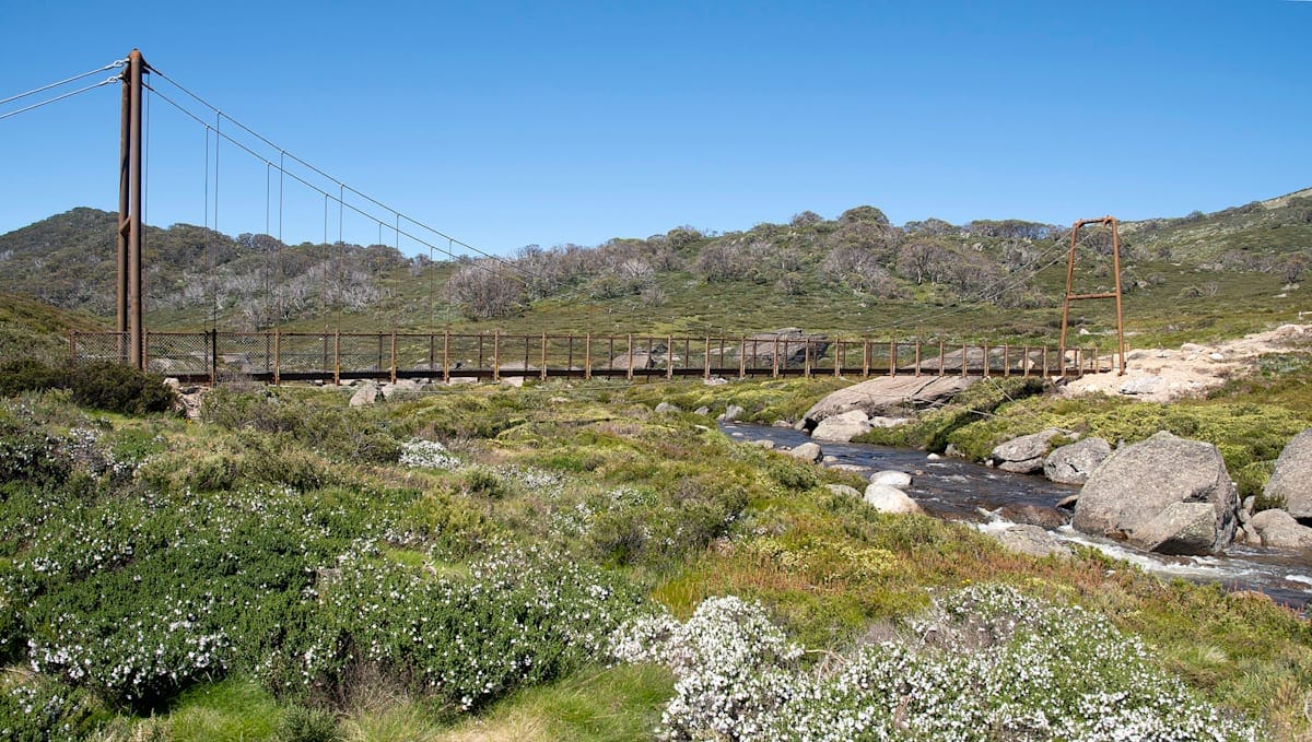 As the Guthega ski slopes appear in the distance you are about to take your first glimpse of the new Spencers Creek bridge, the highest suspension bridge in Australia at 1640 metres elevation.