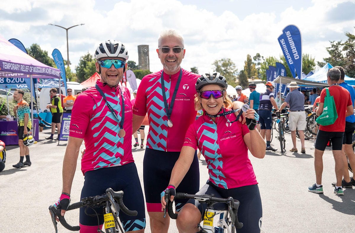Jindabyne Cycling Club members Kent Carpenter, Scott Carpenter and Sheryl Rotondo after the race in 2022.