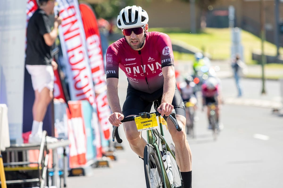 Cooma rider John Sim crosses the finish line in the 110km race in 2022.