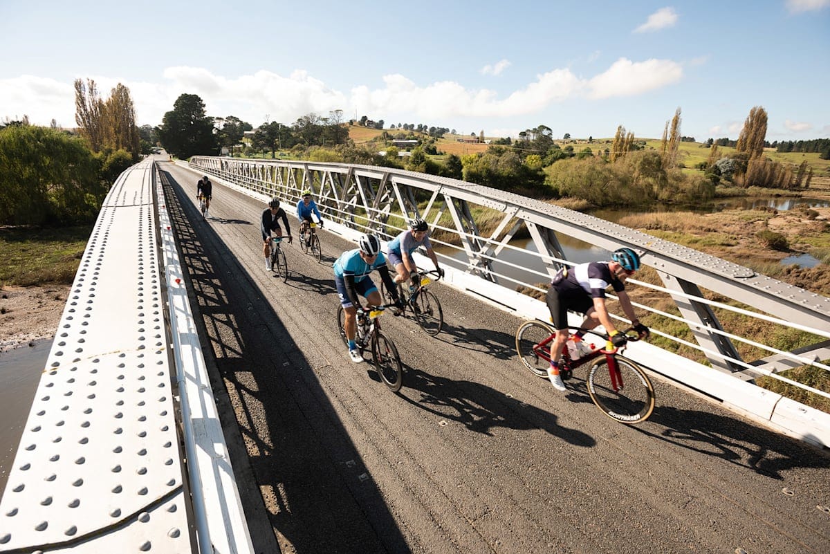 Riders cross the historic Dalgety Bridge over the Snowy River. PHOTO: Snowy Classic