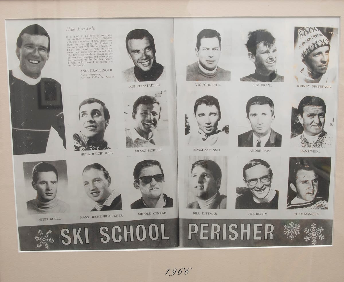 In 1960 the Perisher Ski Association forms the Perisher Ski School with Jean Ecuyer (captain), Jonny Mueller, Erich Walka, Jean-Claude Decostard and Denis Bertholet. While Guthega was not part of Perisher resort then, Walter Spanring instructs at Guthega for YMCA Canberra Ski Club members (now Brindabella Ski Club).