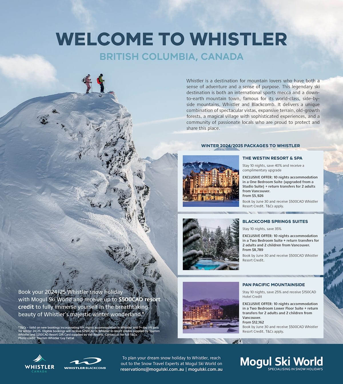 Enjoy up to 25% savings, complimentary upgrades and up to $500CAD Resort Credit when you book with Mogul Ski World by August 31. (Hotel specials in adjoining page advert must be booked by June 30). T&Cs apply.